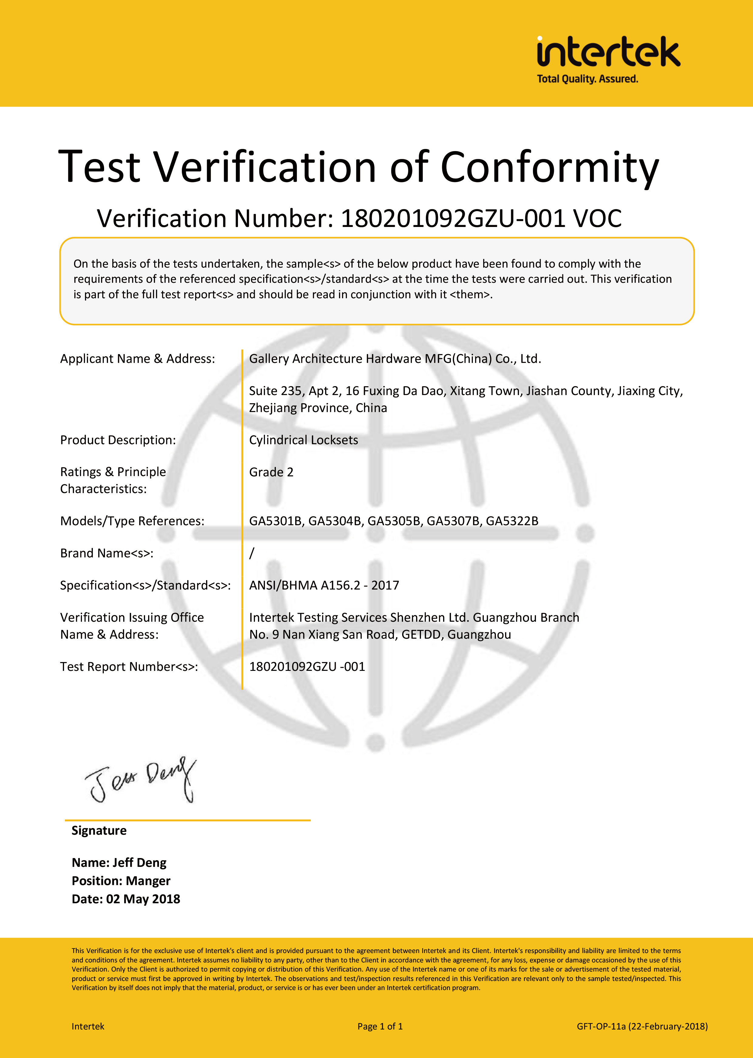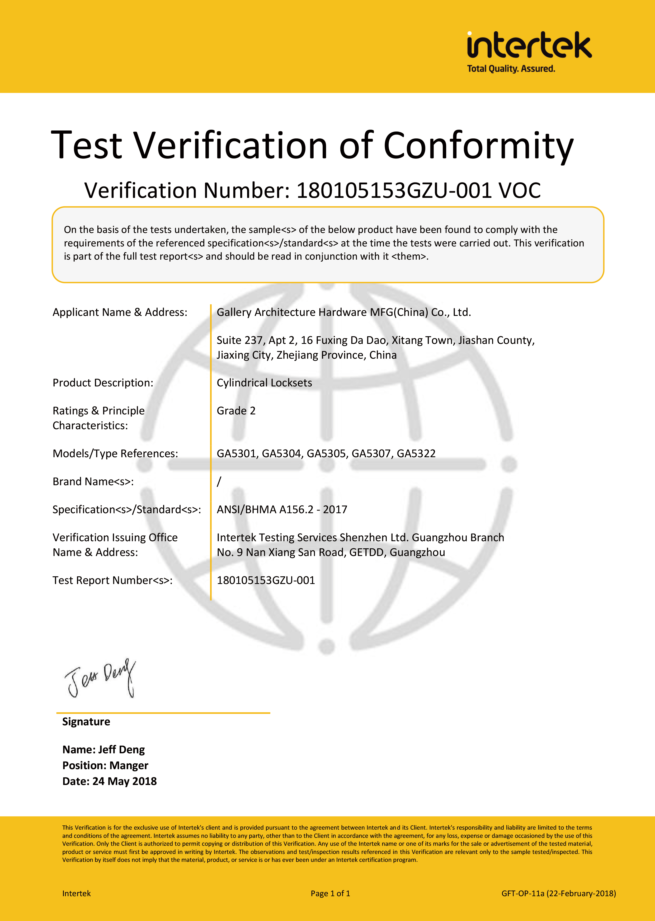 浙江堅迪五金制造有限公司始建于 1995 年。自 2003 開始,公司致力于高標準商業(yè)鎖的研發(fā)工作,并于 2006 及 2007 年,8700 插芯鎖系列獲得美國國家標準 ANSI A 156.13-2005 一級、ANSI A 156.2-2003 二級和美國 UL 10C3 小時防火測試認證。自 1998 年以來,公司不斷提升產(chǎn)品和客戶服務品質,并獲得了 ISO 9001 的認證。